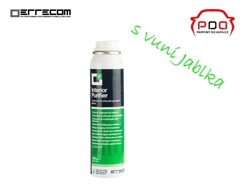 Popis: čistič klimatizace a vzduchotechniky automobilů ve spreji o objemu 100 ml. Dezinfikuje a čistí celý interiér vozu a ventilační soustavu. Odstraňuje nepříjemné pachy během 15 minut a zanechává příjemnou vůni zeleného jablka.