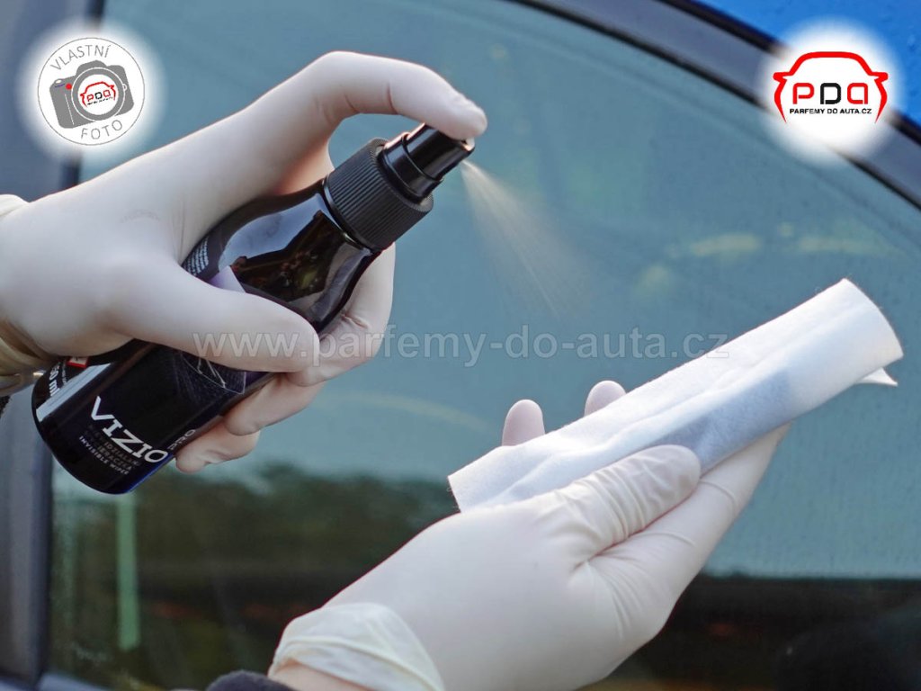 2. Přípravek pomocí rozprašovače naneste na malý hadřík s houbičkou (stačí 2 - 3 střiky, produkt je velmi účinný) a poté aplikujte na dokonale čisté a suché sklo. Plochu skla je vhodné rozdělit na 2 až 3 části a po nanesení jedné poloviny rozleštit. Doporučujeme nanášet produkt nejprve zleva doprava a poté shora dolů. Nechte působit po dobu 8-12 minut.