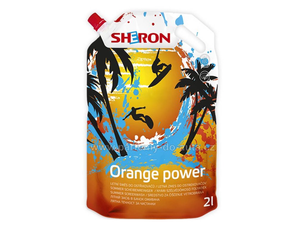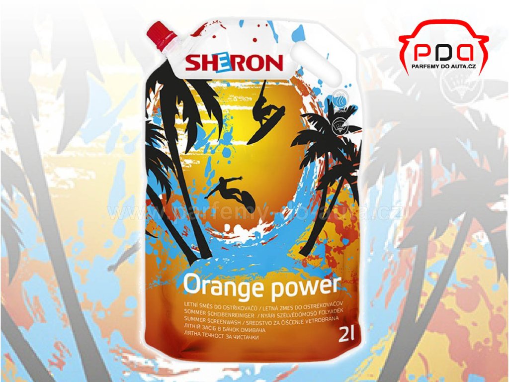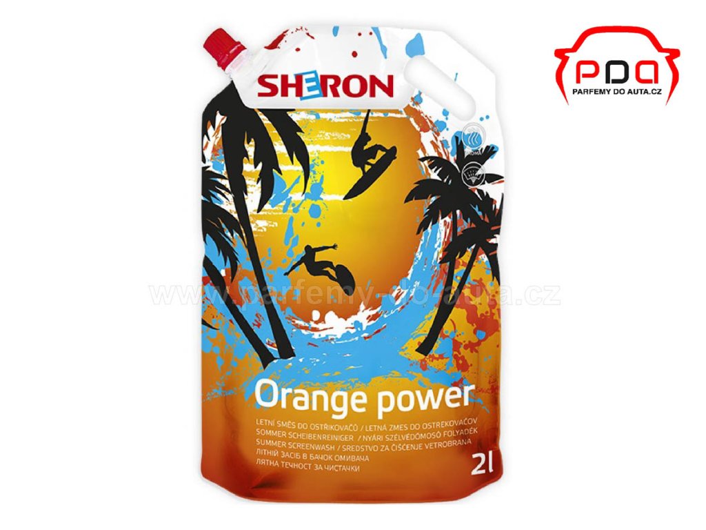 Sheron Orange Power je speciální letní kapalina do ostřikovačů automobilů s hydrofobním efektem. Kapalina obsahuje Tenzid, který na sebe navazuje částice nečistot. Díky tomu jsou nečistoty rozptýleny do vodného roztoku a spláchnuty z povrchu skla. Lepší výhled z vozidla zajišťují složky, které odpuzují vodu a ostatní nečistoty včetně hmyzu. Přídavek parfému je bonus, který zpříjemní jízdu. Při každém použití ostřikovačů ucítíte závan osvěžující vůně. Tento druh kapaliny je nejkvalitnější provedení od výrobce Sheron.