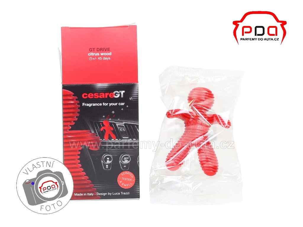 Cesare GT je vůně z porézní pryže EVA (gumy) ve tvaru panáčka, která je napuštěná přírodním vonným olejem s aktivními molekulami pohlcující pachy bez obsahu alkoholu a toxických látek. Úchvatný design v podobě žebrovaného sportovního vzhledu, evokuje rychlost a stabilitu závodních vozů. Přináší emoce a velkolepý sportovní styl pro obohacení interiéru Vašeho vozu. Přesně tak si slavný návrhář a tvůrce designu Luca Trazzi představuje vůni pro náročné řidiče milující sportovní jízdu. Barvy a vůně jsou inspirovány různými jízdními styly.