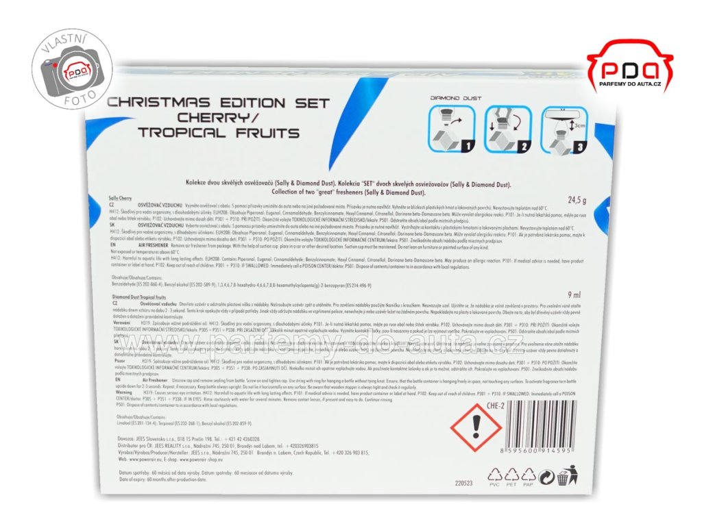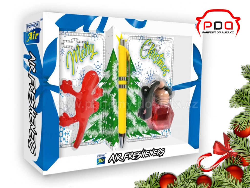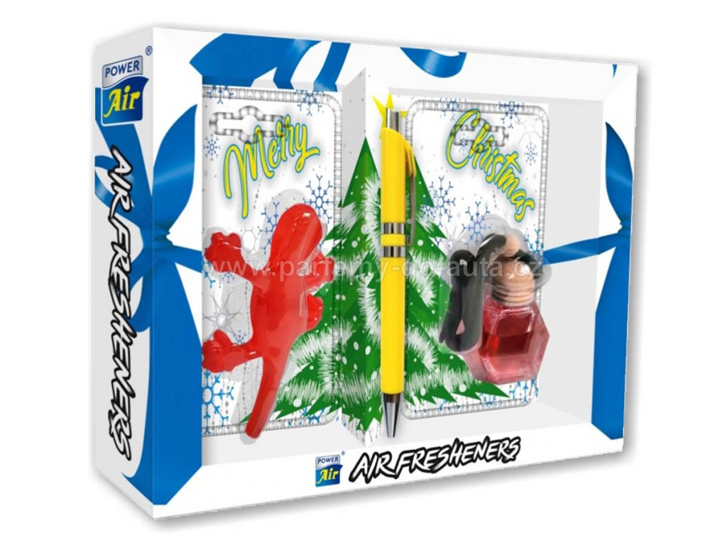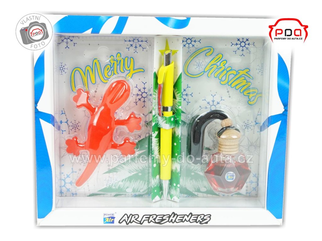 Air Fresheners - Cherry/Tropical Fruits je vánoční dárkové balení nejprodávanějších vůní do auta značky Power Air. Dárkové balení s Vánočním motivem obsahuje oblíbenou 3D vůni do auta Sally ve tvaru ještěrky s vůní Cherry, která se připevňuje na hladké povrchy pomocí přísavky na spodní straně vůně. Dále balení obsahuje Diamond Dust osvěžovač 9ml vzduchu s vůní Tropical Fruits ve skleničce ve tvaru diamantu s dřevěným víčkem k zavěšení do volného prostoru. A jako bonus obsahuje balení praktické kuličkové psací pero. Obal Air Fresheners je tvořen papírovou krabičkou s barevným potiskem a průhledným plastovým víkem.
