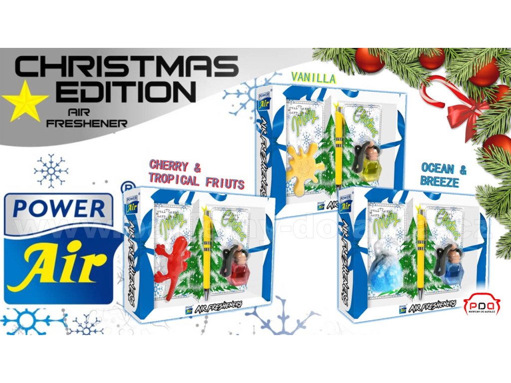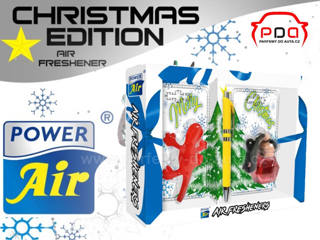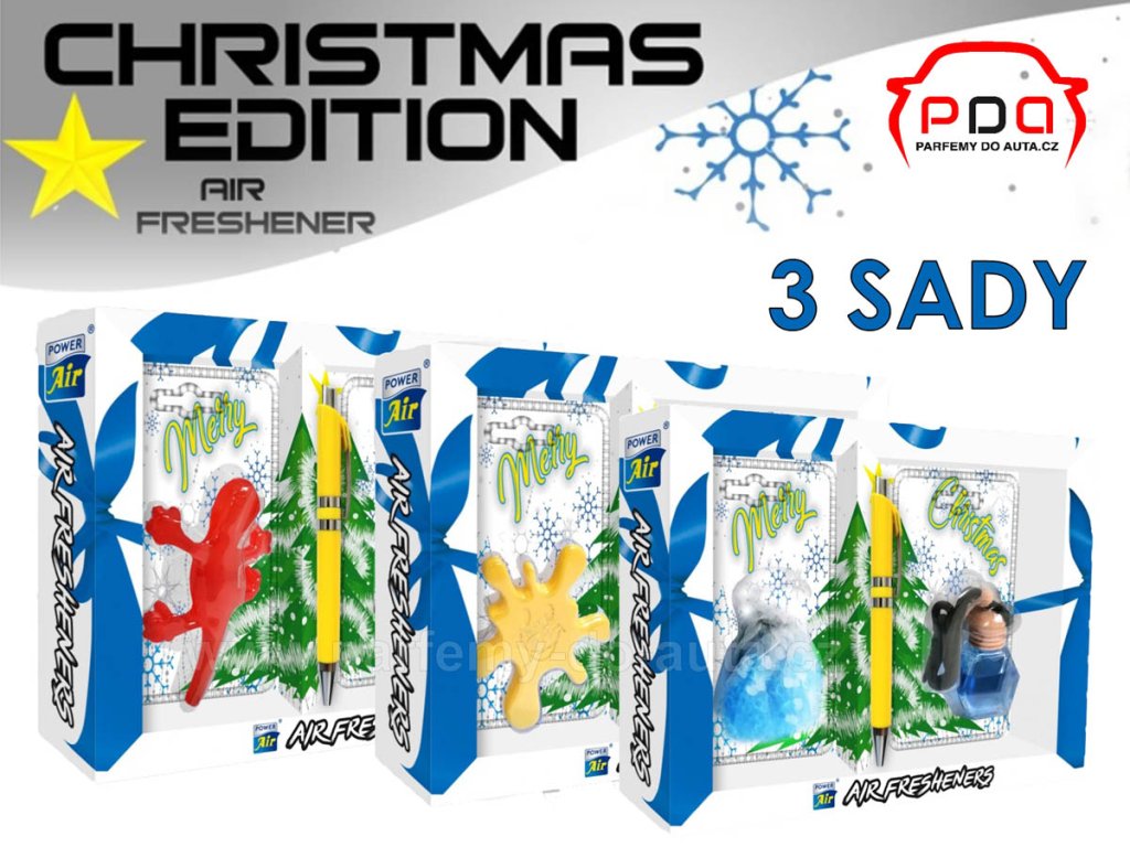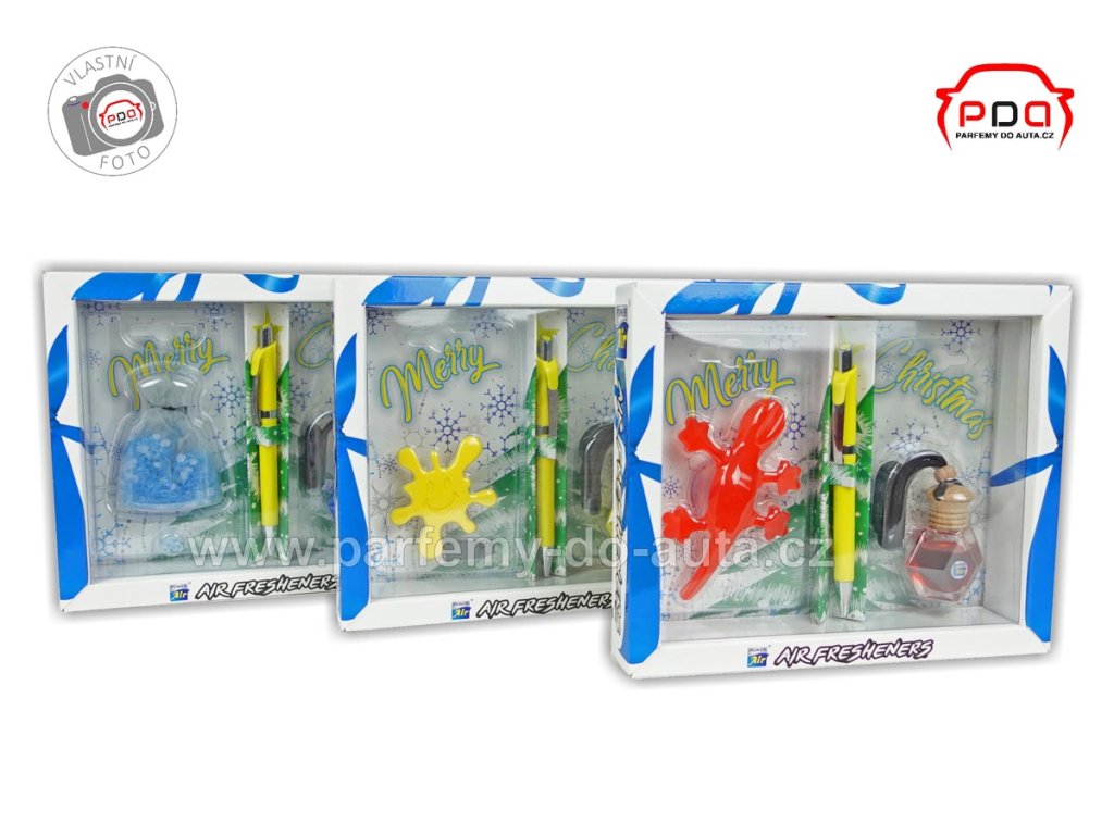 Air Fresheners - Cherry/Tropical Fruits je vánoční dárkové balení nejprodávanějších vůní do auta značky Power Air. Dárkové balení s Vánočním motivem obsahuje oblíbenou 3D vůni do auta Sally ve tvaru ještěrky s vůní Cherry, která se připevňuje na hladké povrchy pomocí přísavky na spodní straně vůně. Dále balení obsahuje Diamond Dust osvěžovač 9ml vzduchu s vůní Tropical Fruits ve skleničce ve tvaru diamantu s dřevěným víčkem k zavěšení do volného prostoru. A jako bonus obsahuje balení praktické kuličkové psací pero. Obal Air Fresheners je tvořen papírovou krabičkou s barevným potiskem a průhledným plastovým víkem.