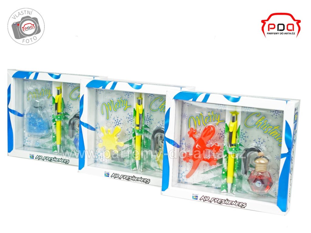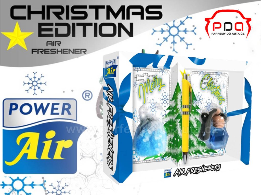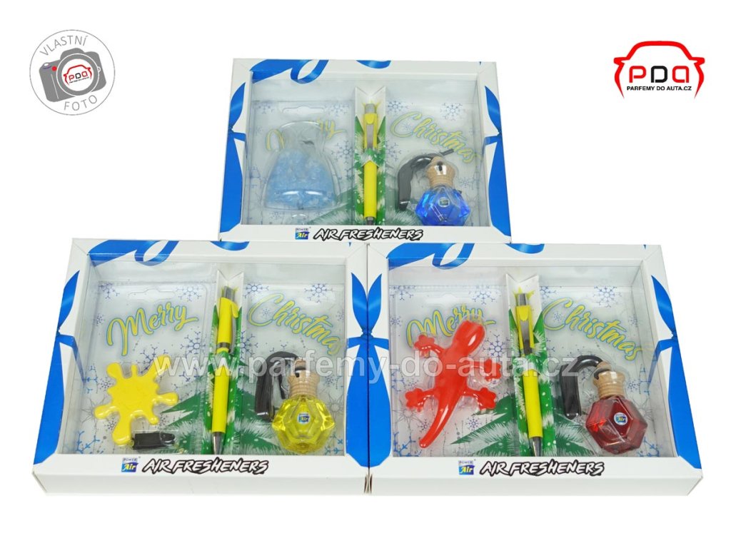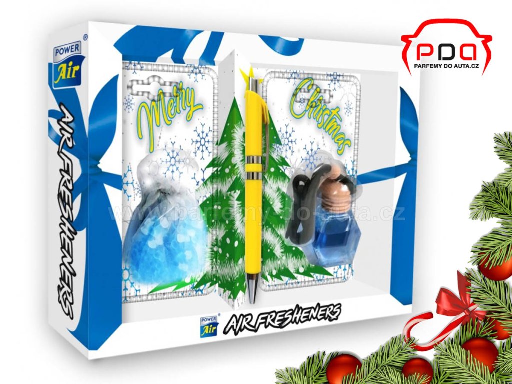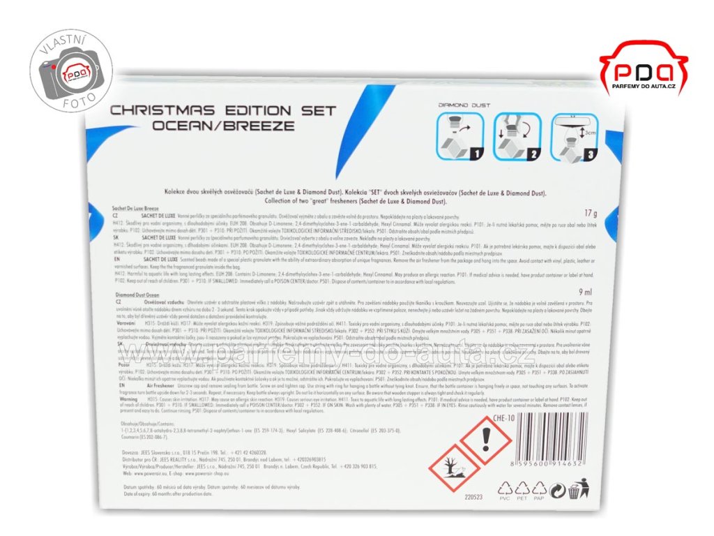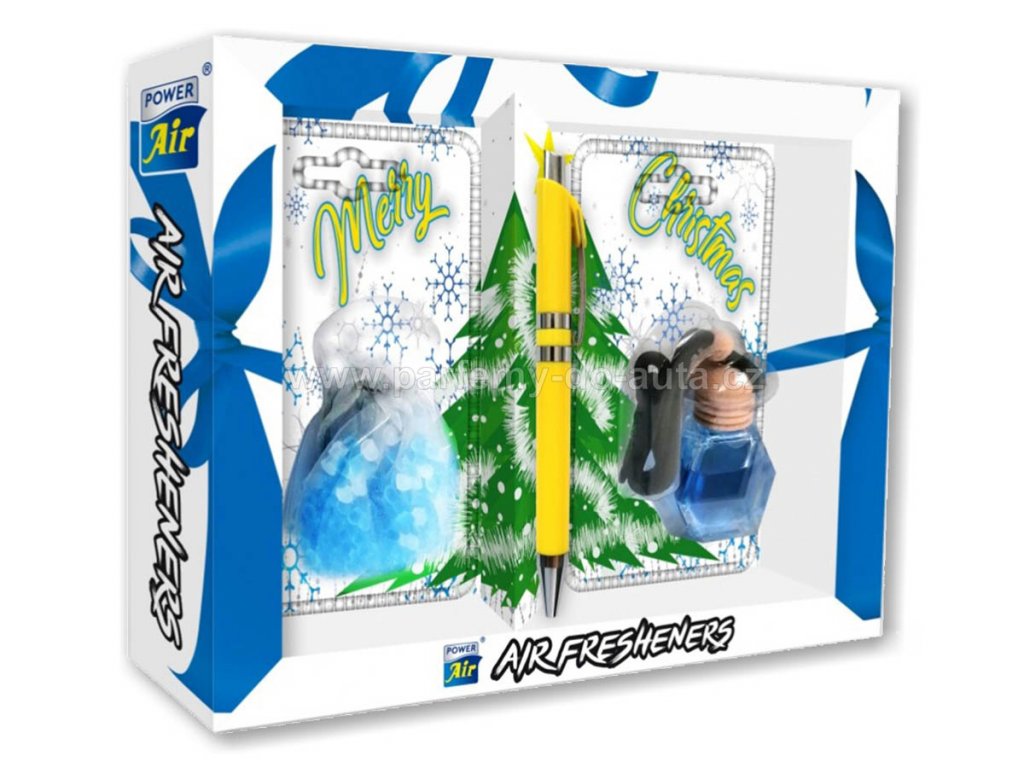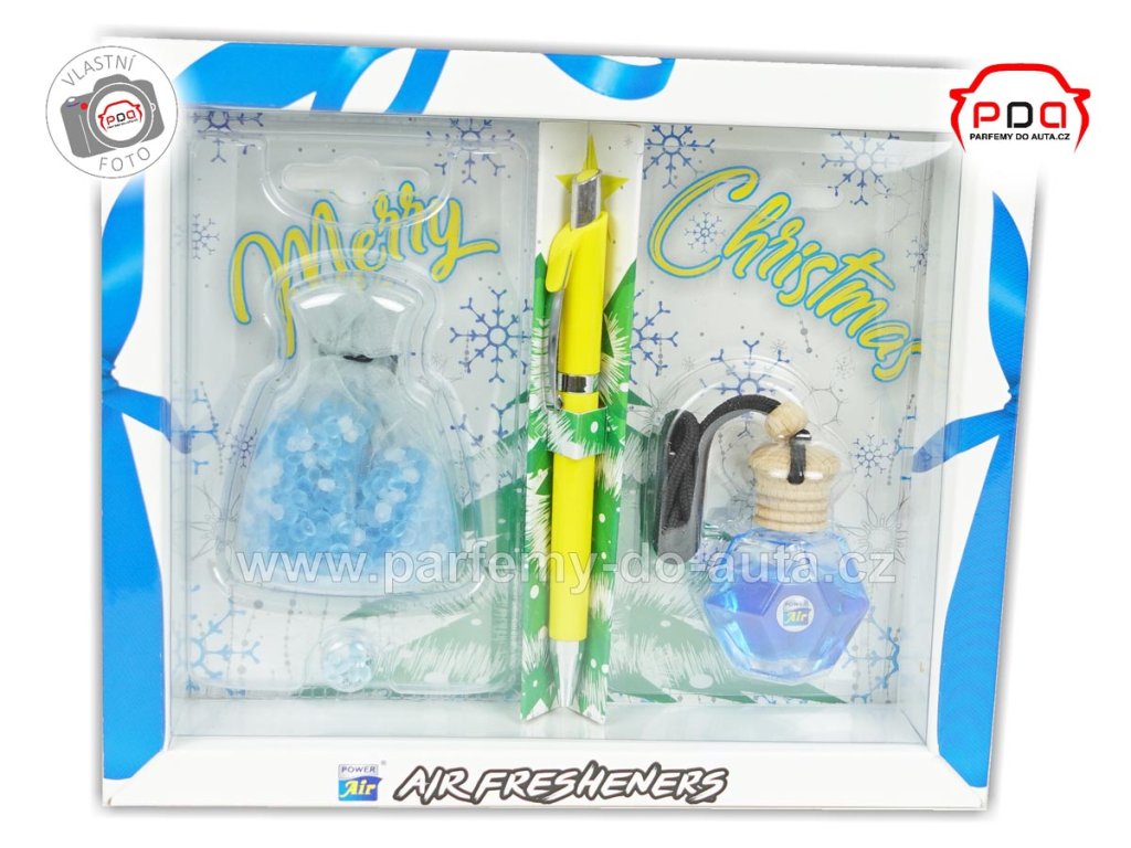 Air Fresheners - Ocean/Breeze je vánoční dárkové balení nejprodávanějších vůní do auta značky Power Air. Dárkové balení s Vánočním motivem obsahuje oblíbenou vůni do auta Sachet De Luxe Brezze. Jedná se o závěsný pytlík s vonnými kamínky s vůní svěží vánek. Dále obsahuje závěsnou vůni v lahvičce Diamond Dust s vůní Ocean (svěží vůně oceánu), která se zavěsí do volného prostoru. A jako bonus obsahuje balení praktické kuličkové psací pero. Obal Air Fresheners je tvořen papírovou krabičkou s barevným potiskem a průhledným plastovým víkem.