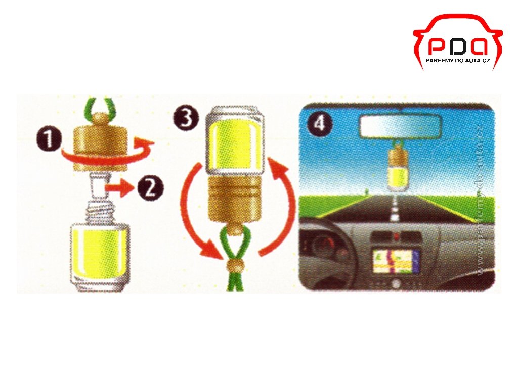 Vůni Little Bottle zavěste na vhodné místo v interiéru vozu a během používání kontrolujte dotažení víčka, aby nedošlo k vylití kapaliny.