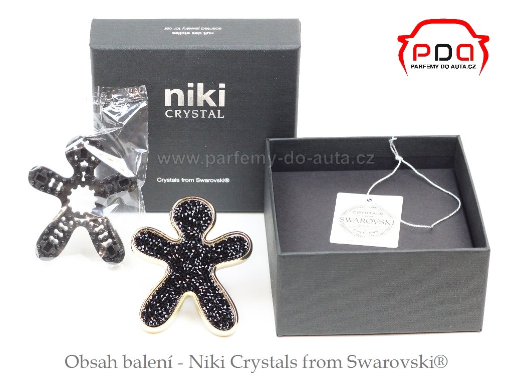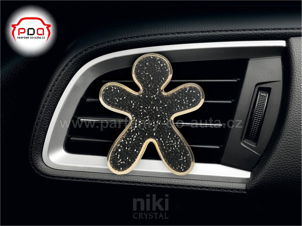 Stručný popis: unisex vůně panáček do auta Niki Crystal Black – Gold - After Midnight (po půlnoci) s černými kameny Swarovski a zlatým rámečkem je nejluxusnější designová vůně do auta na světovém trhu, která se připevňuje na výdech ventilace automobilu. Má vyměnitelné náplně z EVA napuštěné přírodními vonnými oleji, které zajišťují efektivní provonění interiéru automobilu. Intenzitu vůně regulujete sílou ventilátoru. Lze dokoupit náhradní náplně s různými druhy vůní.