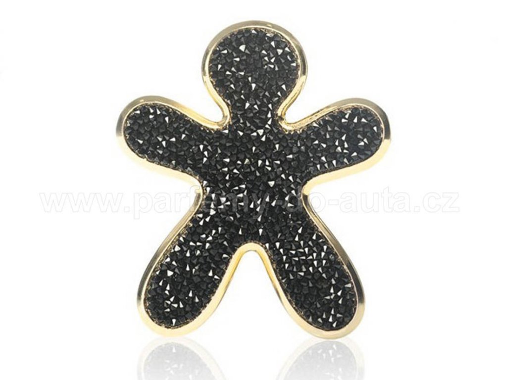 Obsah balení: hodnotně vyhlížející papírová krabička, designový kryt ve tvaru panáčka s černými krystaly Swarovski, vonná náplň z Eva pryže a univerzální klip pro přichycení vůně na ventilační mřížku automobilu.
