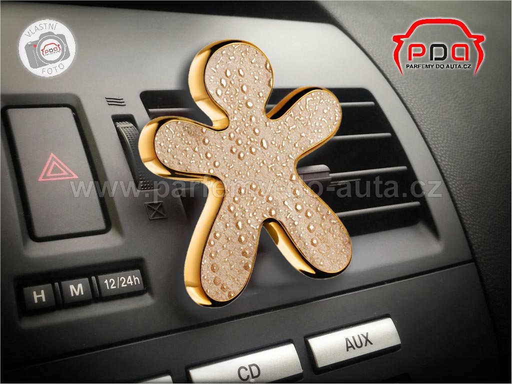 Obsah balení: plastová krabička, designový kryt (zlatý panáček NIKI Fashion Fresh Air), vonná vložka (náplň) a univerzální klip